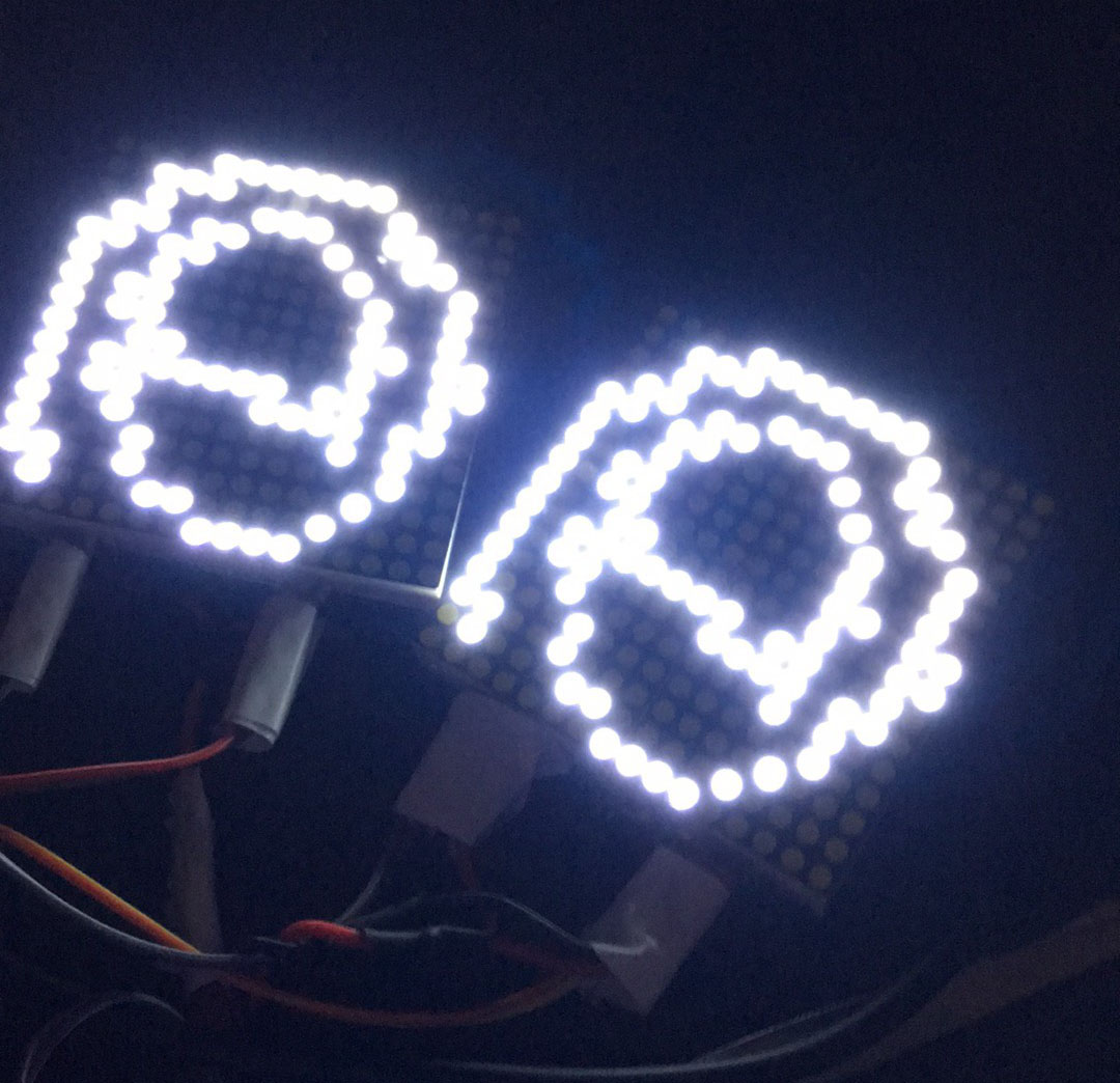 The LED matricies were paired up and superglued together to create two 16x16 matrices, one for each eye. The deiver boards communicated with the feather using I2C, and each had 3 solderable pads that indicated their address (allowing for 8 total), these were soldered to address the matrices 0-3. This allowed me to create a makshift buss that all the matrices connected too, but would only listen to if I so desired. Finally all of the matrices were powered in parallel from the 5V pin on the featherboard.